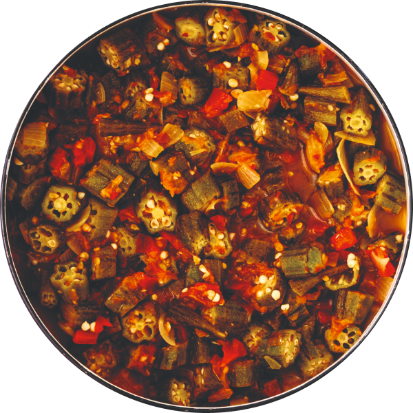 Okra stew is a simple dish from the Bapedi people in Limpopo, South Africa. Similar versions can be found in most Southern African countries, including Zimbabwe and Zambia, where okra is easily sourced and has been enjoyed for generations. This stew uses simple ingredients and can be enjoyed with any starch of choice, but the most popular is Pap (page 186) or Sadza (page 148), both dishes made with cornmeal (maize meal) that are common in Southern Africa. This dish always makes me think of moments in my grandmother’s kitchen. Like many of her dishes, it’s simple yet very nutritious. Okra’s unique texture can take some getting used to, but it’s delicious and adds interesting texture to a meal.